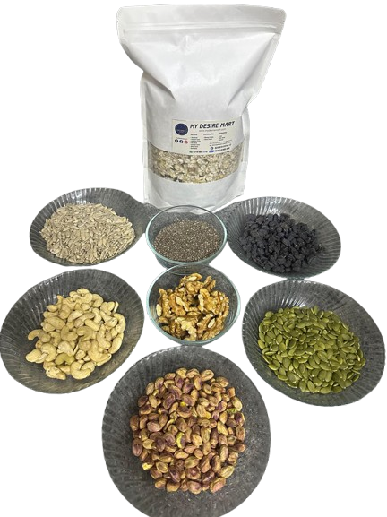 Blend of Barley Oats with:Walnuts (Akhrot)Cashew (Kajo)Pistachio (Pista)Raisin (Khismish)Chia SeedsPumpkin SeedsSunflower Seeds