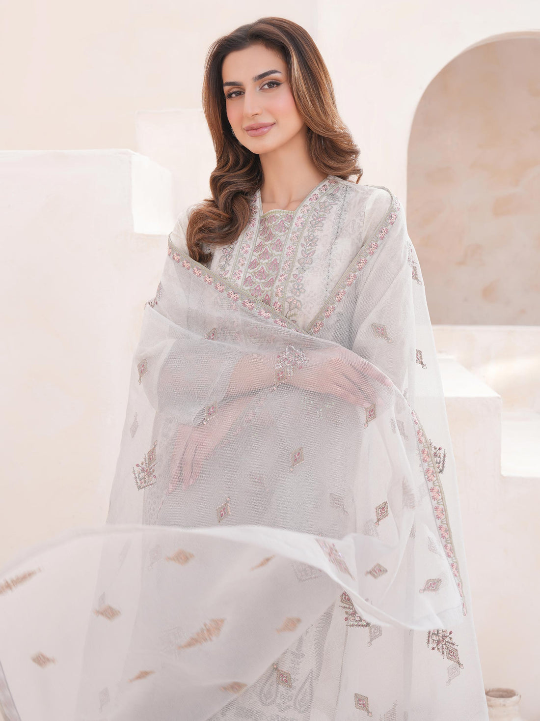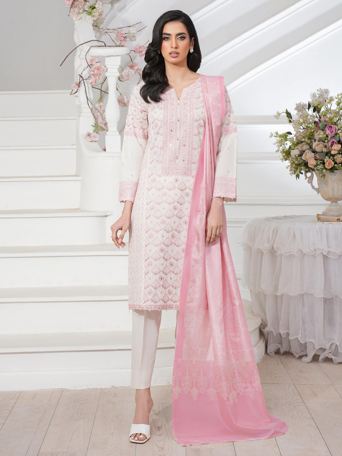 Shirt Dyed embroidered shirt1.83 M Fabric: Lawn Massouri Dupatta Printed dupatta 2.5 M Fabric: Monar...