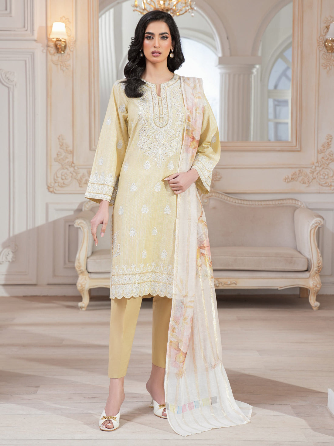 Shirt Gold emboss print embroidered shirt1.83 M Fabric: Lawn Dupatta Dyed dupatta 2.5 M Fabric:...