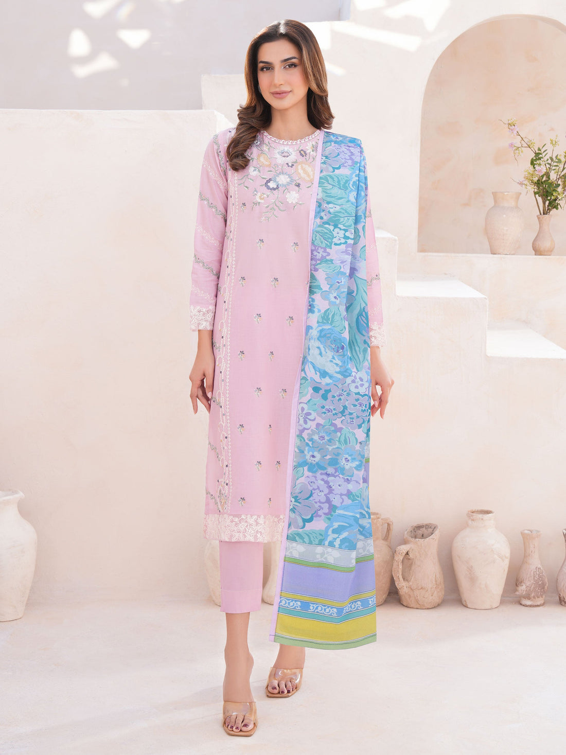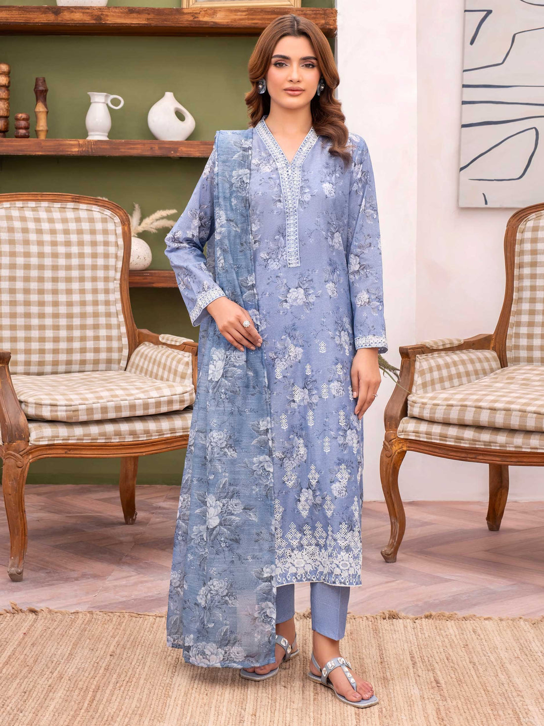 Shirt Embroidered shirt1.83 M Fabric: Slub Lawn Dupatta Printed dupatta 2.5 M Fabric: Chiffon Trouser...