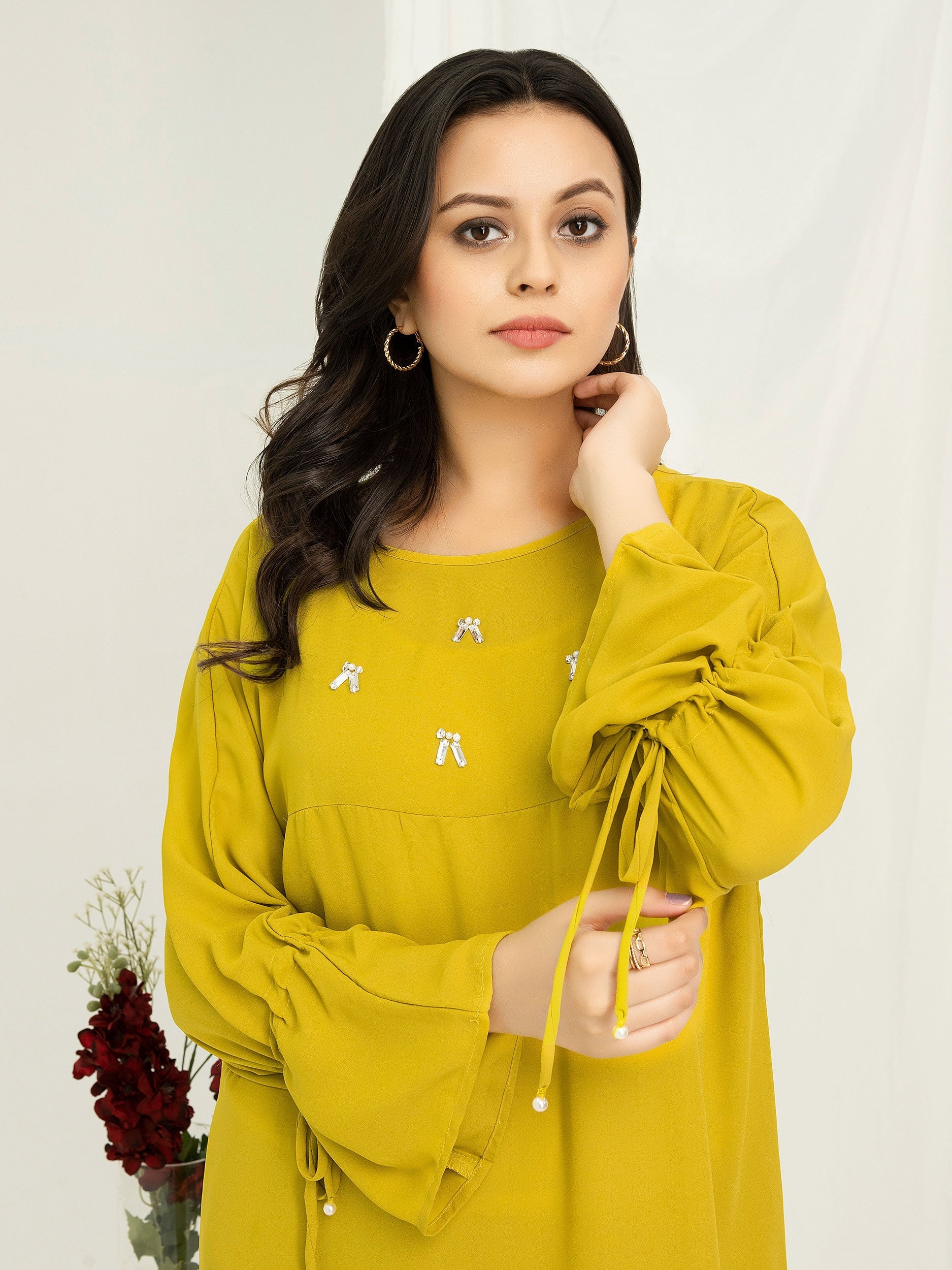 - Sleeves with draw string closure & pearl tassels